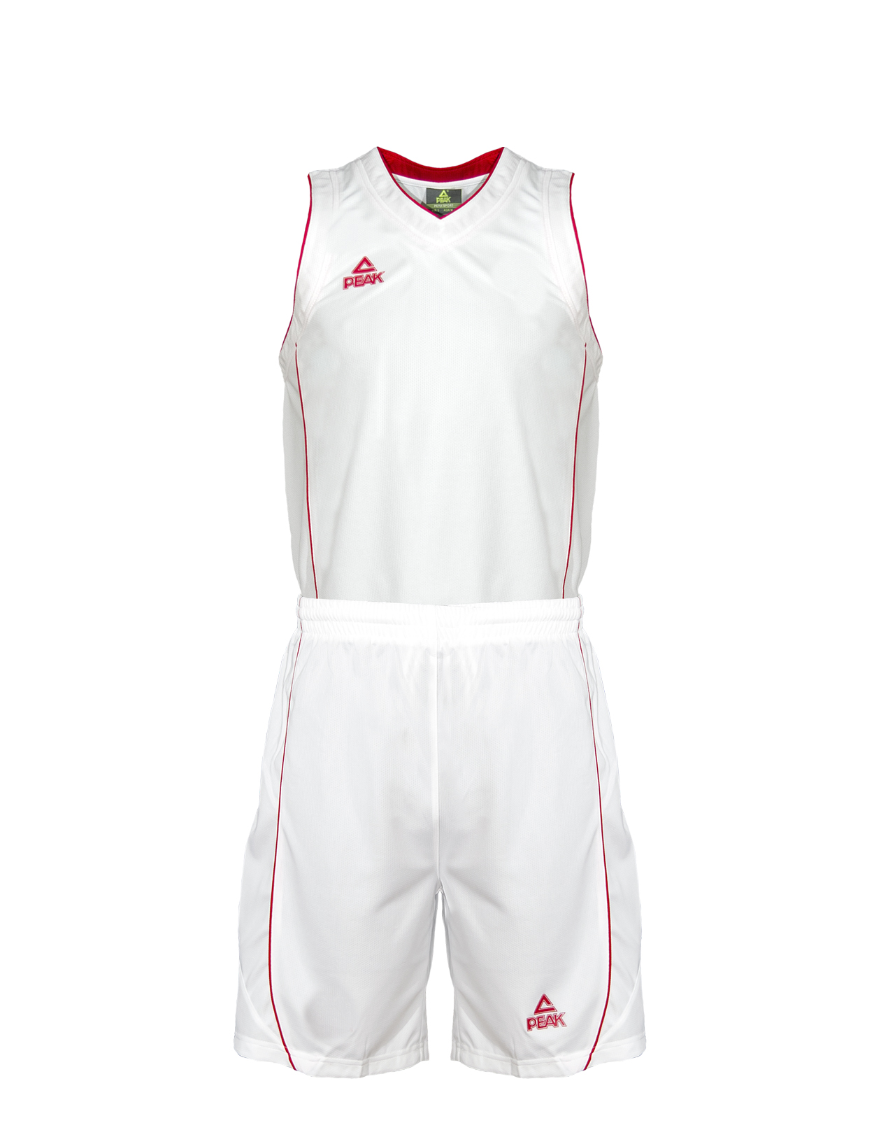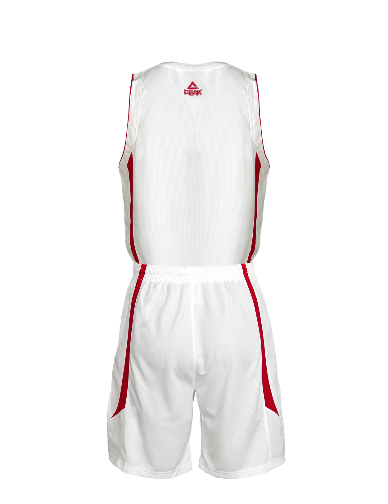 Das qualitativ hochwertige Trikot hat weiß abgesetzte Bündchen und Streifen und ein kleines, farblich passendes PEAK-Logo im Brustbereich. Die Shorts haben entsprechend weiße, seitliche Streifen und ein kleines PEAK-Logo auf dem linken Bein.